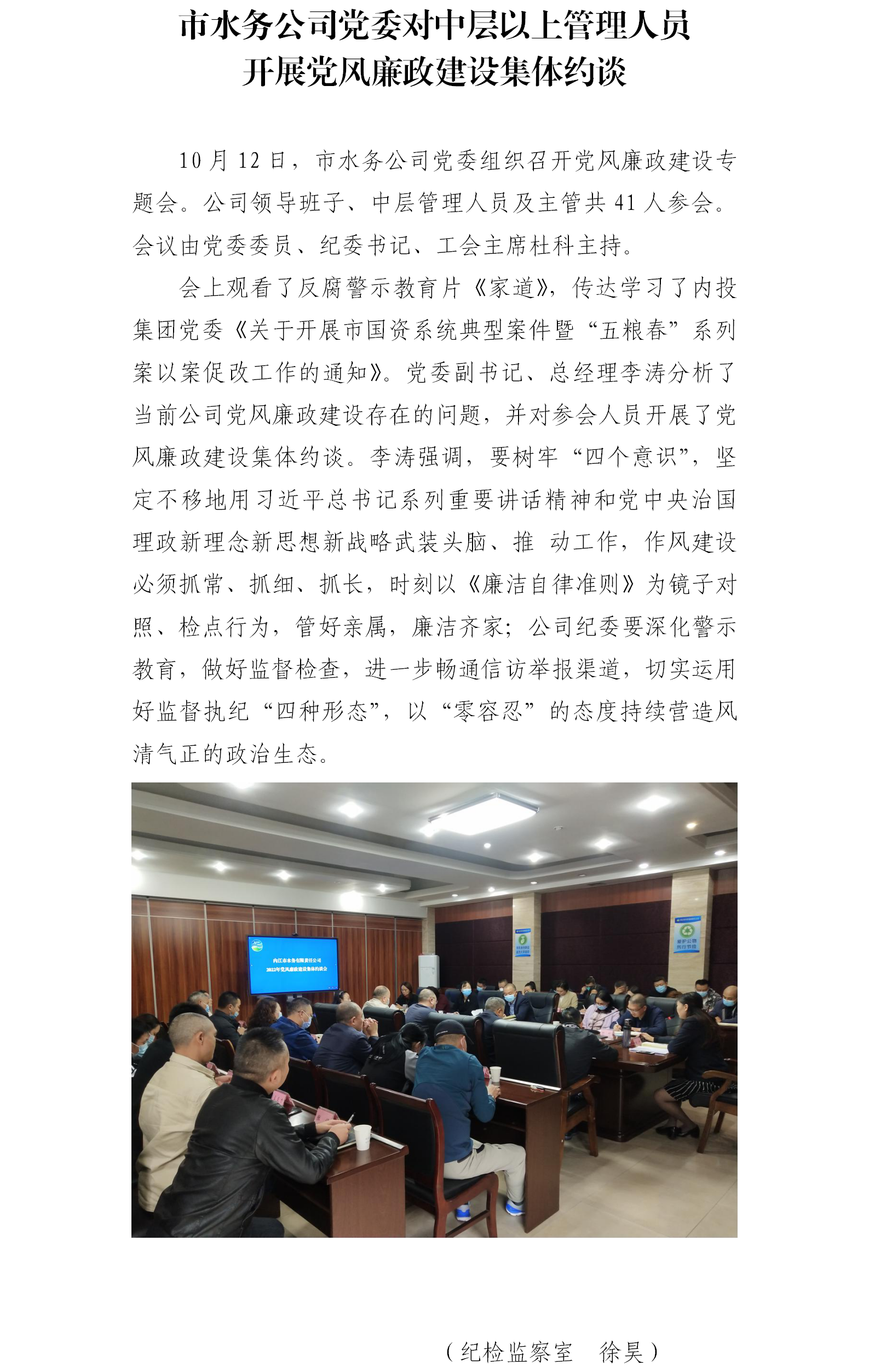 市水務(wù)公司黨委對(duì)中層以上管理人員開展黨風(fēng)廉政建設(shè)集體約談