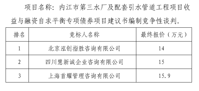 內(nèi)江市第三水廠及配套引水管道工程項(xiàng)目收益與融資自求平衡專項(xiàng)債券項(xiàng)目建議書編制談判結(jié)果公示