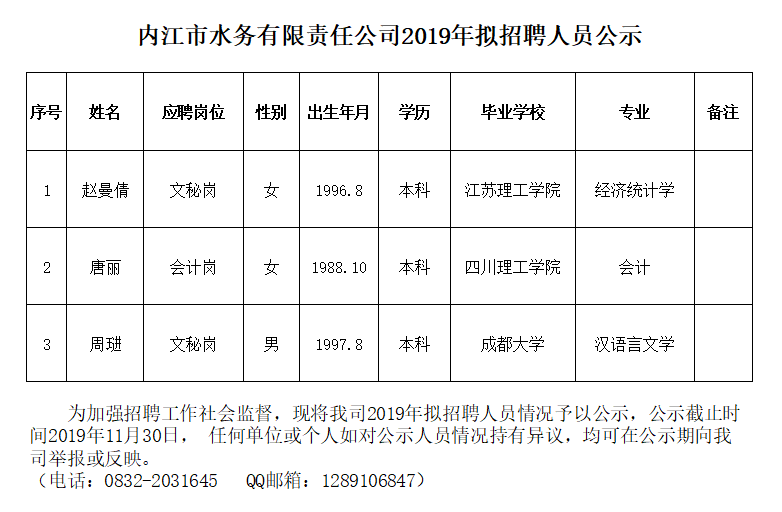 內(nèi)江市水務(wù)有限責(zé)任公司2019年擬招聘人員公示