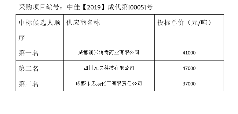 內(nèi)江市污水處理有限責(zé)任公司碳源補(bǔ)充劑和輔助消毒劑招標(biāo)項(xiàng)目(第2包)評(píng)標(biāo)結(jié)果公示