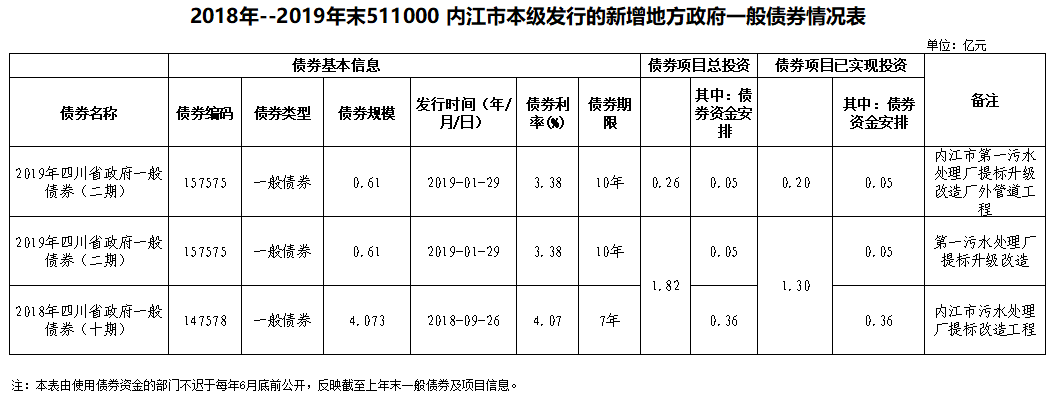 2018年--2019年末511000 內(nèi)江市本級(jí)發(fā)行的新增地方政府一般債券情況表