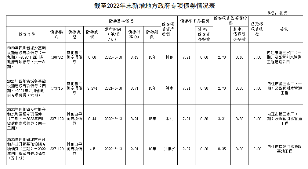 內(nèi)江市本級截至2022年末新增地方政府債券存續(xù)期信息公開(水務(wù))