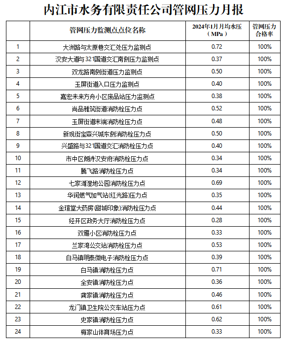 內(nèi)江市水務(wù)有限責(zé)任公司2024年1月管網(wǎng)壓力月報(bào)