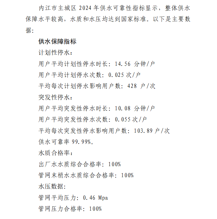 內(nèi)江市水務(wù)有限責(zé)任公司供水可靠性保障指標(biāo)數(shù)據(jù)公示