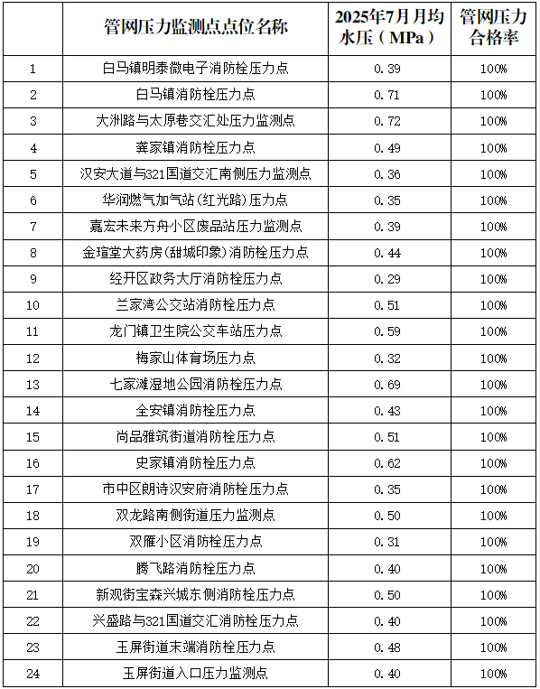 內(nèi)江市水務(wù)有限責任公司2025年7月管網(wǎng)壓力月報