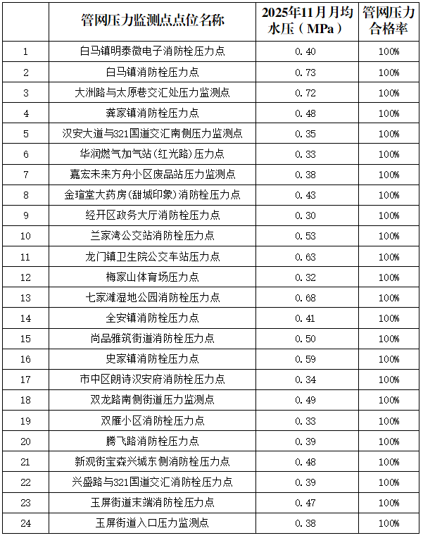 內(nèi)江市水務(wù)有限責任公司2025年11月管網(wǎng)壓力月報