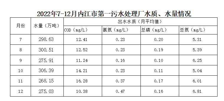 內(nèi)江市污水處理有限責(zé)任公司第一污水處理廠2022年7-12月水量、水質(zhì)情況
