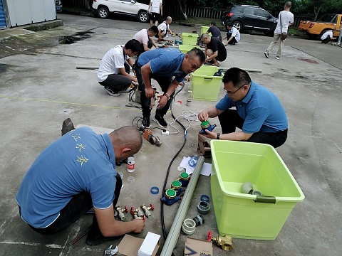 7月20日下午,二水廠維修車間門前,來自市水務(wù)公司管網(wǎng)運行部、鄉(xiāng)鎮(zhèn)供水部的11支隊伍22名技能好手,正在緊張進(jìn)行著搶維修實操比賽:有的正認(rèn)真識別設(shè)計圖;有的正在切割水管,熔合管道;有的已經(jīng)開始組裝管道、閥門......一個個全神貫注,顧不上汗水模糊了眼睛,浸濕了衣裳。這是公司開展搶維修技能競賽上實際操作環(huán)節(jié)的一個場景。