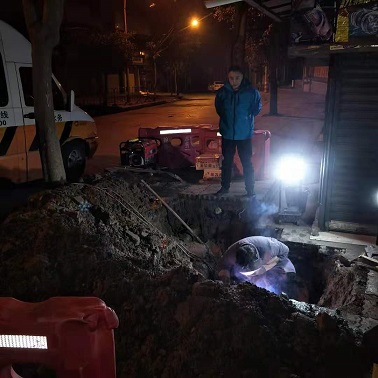 22日晚8點(diǎn)40分,接到市民報漏電話,位于晏家灣車站外的供水主管爆裂,部門立即組織人員趕往現(xiàn)場。經(jīng)查看確認(rèn)為一根DN150供水主管破裂,為了保障居民的正常用水,搶修人員連夜冒雨對供水管道進(jìn)行搶修,經(jīng)過5個小時的搶險作業(yè),于次日凌晨1點(diǎn)完成搶修任務(wù),保障了該區(qū)域居民正常用水。