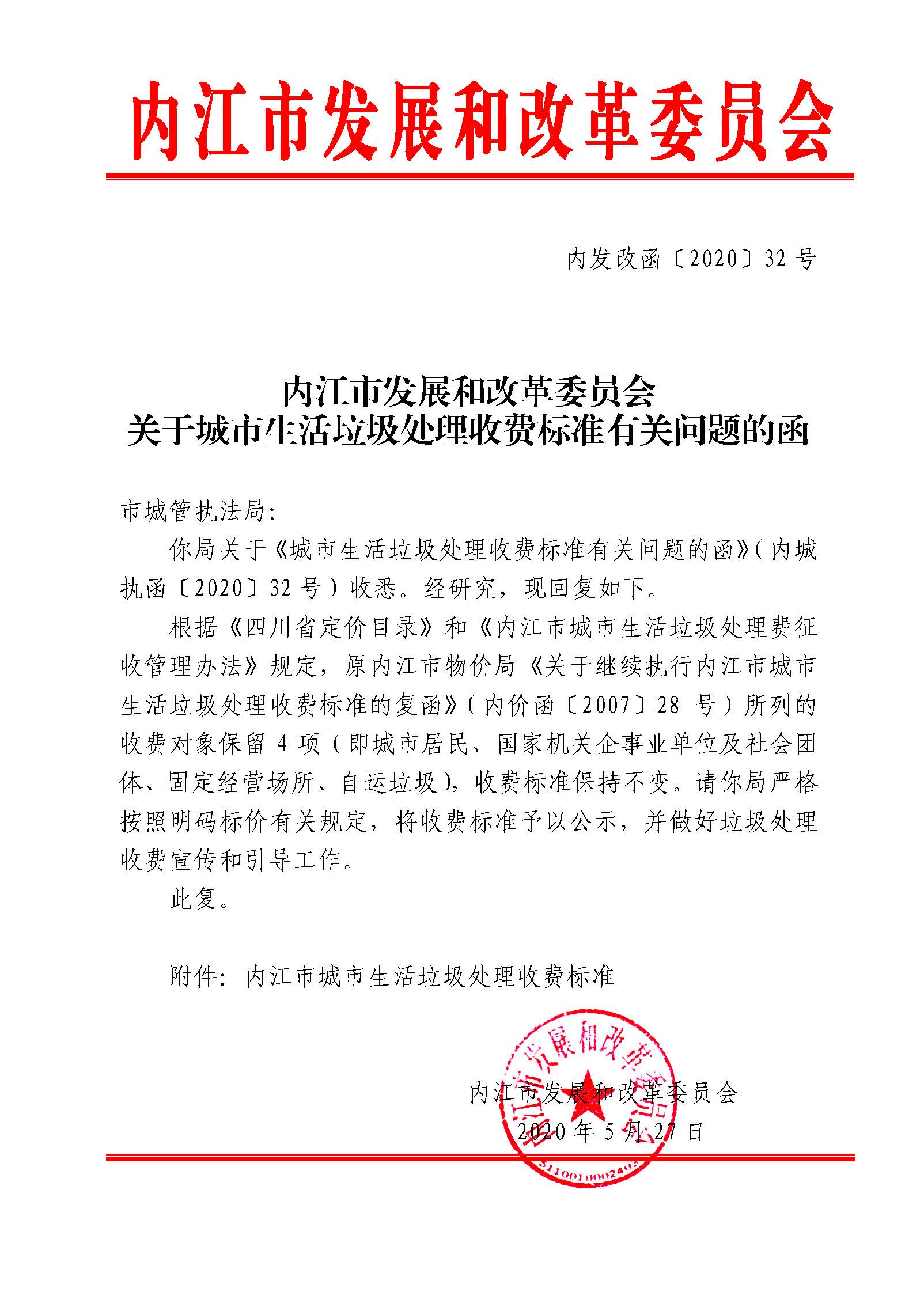 內(nèi)江市發(fā)展和改革委員會(huì)關(guān)于城市生活垃圾處理收費(fèi)標(biāo)準(zhǔn)有關(guān)問(wèn)題的函