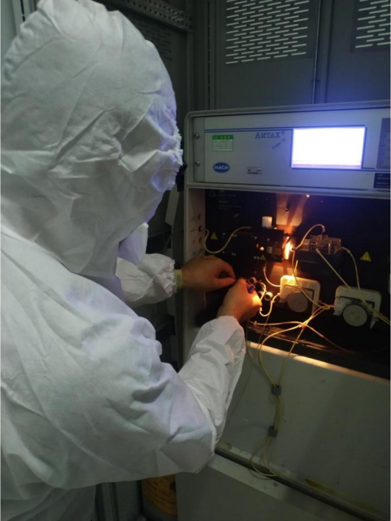 9月11日8時左右,出水氨氮在線監(jiān)測儀器顯示異常,駐廠人員蘇洋、廖劍鋒及時通過視頻連線的方法聯(lián)系在線設(shè)備維護單位相關(guān)技術(shù)人員,通過反復(fù)拆裝電子元器件、清洗過程管路、調(diào)節(jié)發(fā)光源等方式查找原因。經(jīng)過近9個小時的問題排查,駐廠人員發(fā)現(xiàn)是因為檢測器光源異常,造成監(jiān)測數(shù)據(jù)異常,非正常水質(zhì)情況反映,于是立即對該元器件進行檢修調(diào)整,在18點左右出水氨氮在線儀器恢復(fù)正常運行。