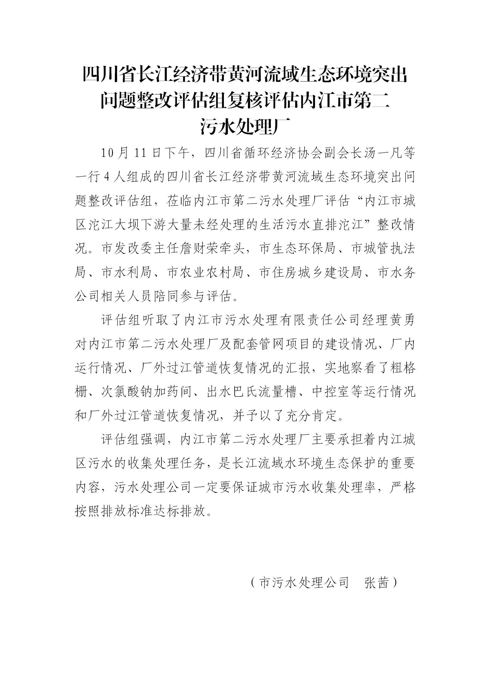 四川省長(zhǎng)江經(jīng)濟(jì)帶黃河流域生態(tài)環(huán)境突出問題整改評(píng)估組復(fù)核評(píng)估內(nèi)江市第二 污水處理廠