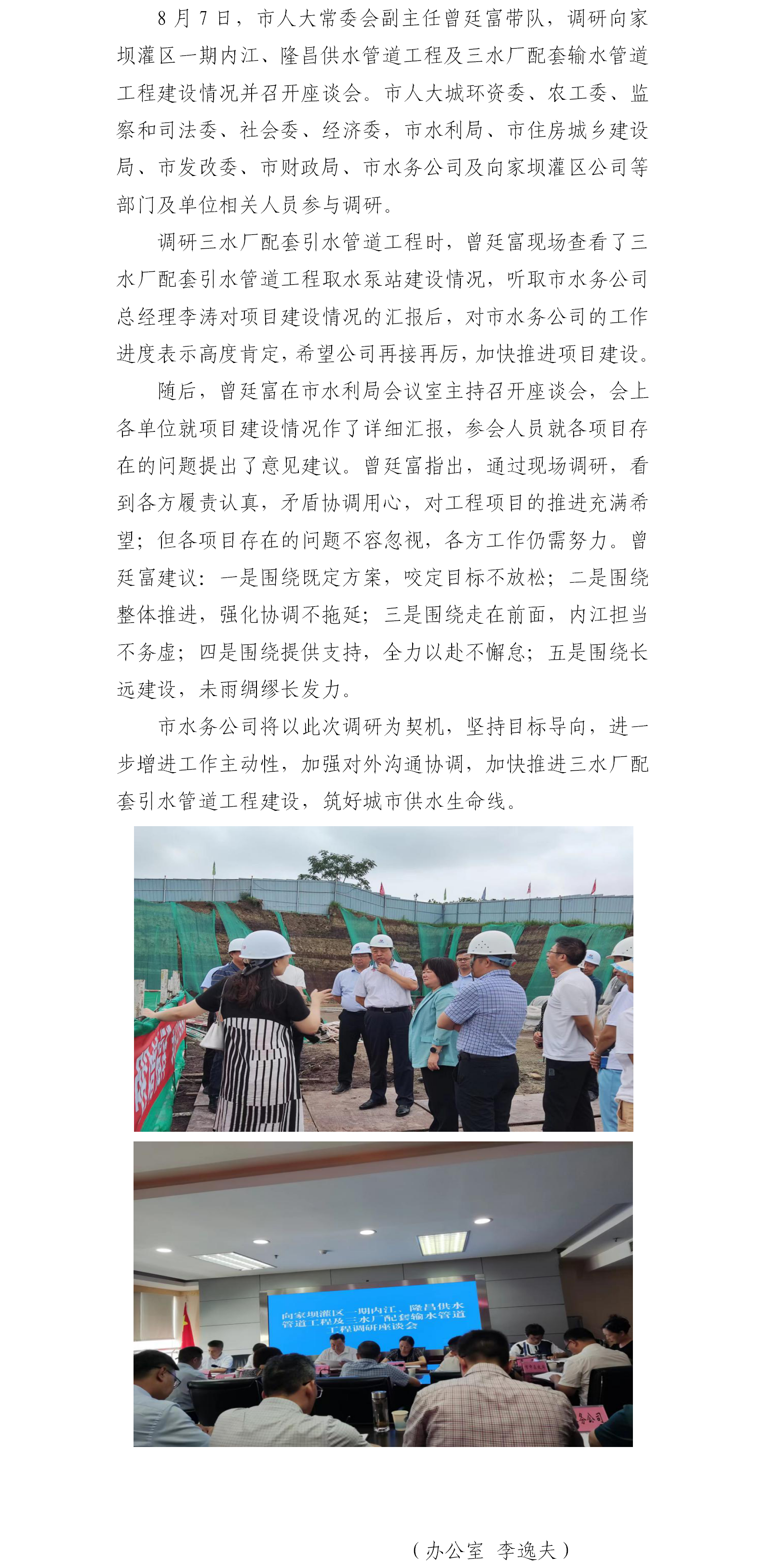 市人大常委會調(diào)研向家壩灌區(qū)一期內(nèi)江、隆昌供水管道工程及三水廠配套引水管道工程