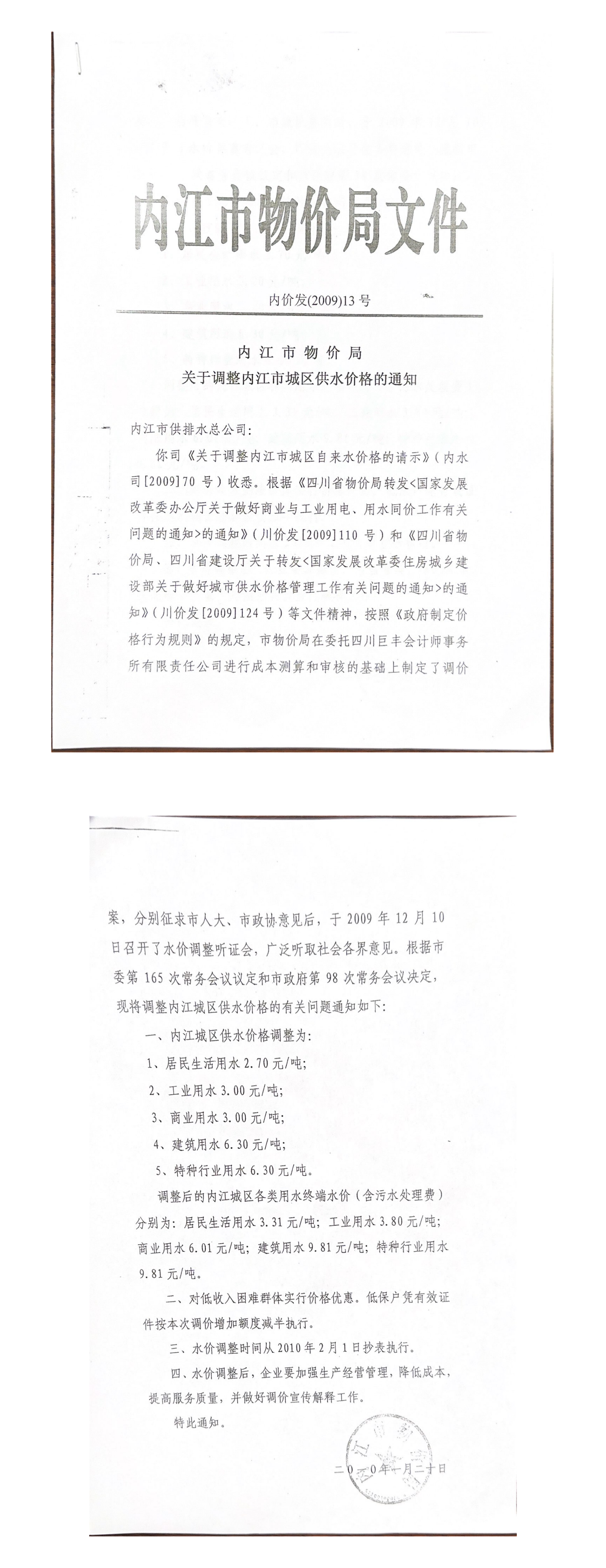 內(nèi)江市物價局關(guān)于調(diào)整內(nèi)江市城區(qū)供水價格的通知