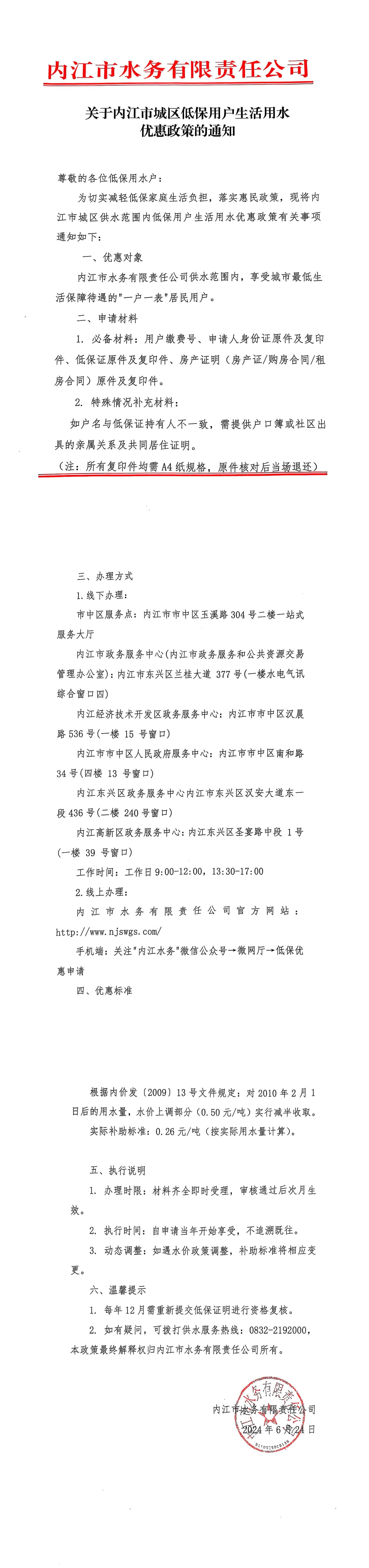 關于內江市城區(qū)低保用戶生活用水優(yōu)惠政策的通知